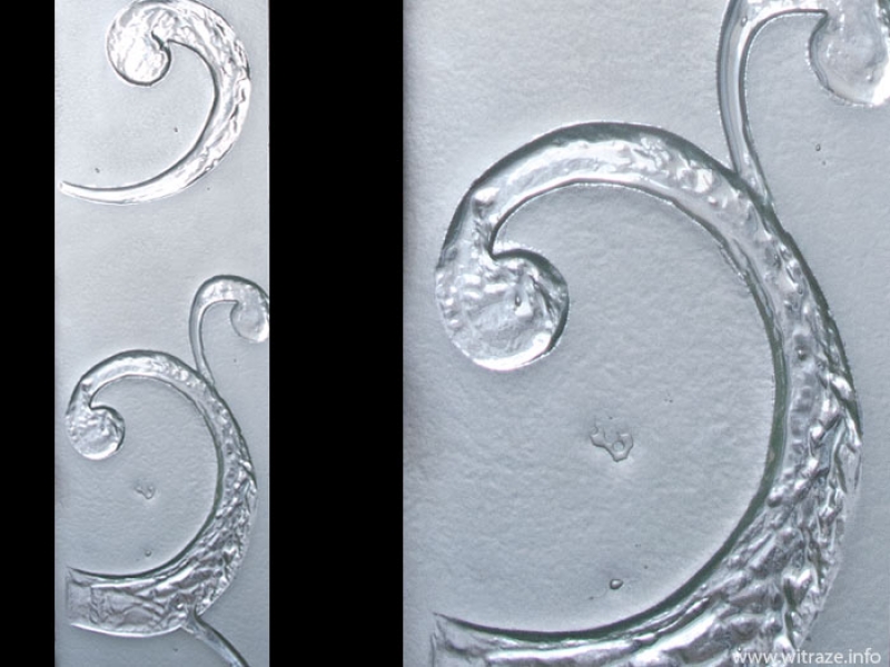 Panele szklane w naturalnym kolorze, z grubym mocnym reliefem. Tło poza wzorem reliefowanym zostało zmatowione. W ten sposób uzyskano nieprzezierność szkła (panele mają oddzielać łazienkę od korytarza) bowiem nawet w części reliefowanej przejrzyste szkło tak intensywnie łamie światło, że nie jest możliwe zobaczenie co się dzieje po drugiej stronie.