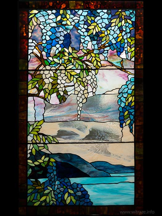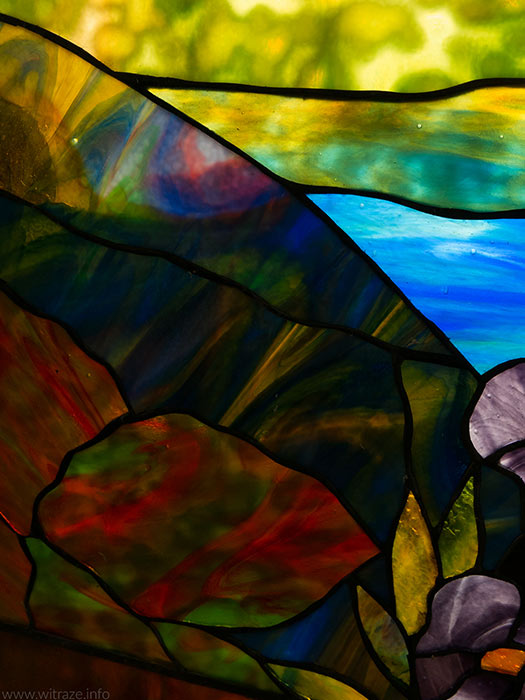 Witraże w drzwiach we wnętrzu rezydencji w Jeleniej Górze. Ze względu na zabytkowy charakter willi, właściciel wybrał witraże w klasycznym stylu, zapoczątkowanym przez L. C. Tiffany'ego już ponad 100 lat temu. Barwne witraże idealnie pasują do zdobnej białej stolarki. Do sześciu par drzwi zostało zaprojektowanych sześć różnych wzorów - krajobrazów z motywami roślinnymi na pierwszym planie. Nad drzwiami wejściowymi i drzwiami do spiżarni znajdują się dodatkowo dekoracyjne witrażowe nadświetla.