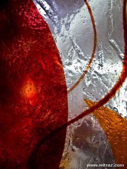 Panel ze szkła artystycznego oddziela przestrzeń wejściową od salonu. Pastelowe, czerwone, pomarańczowe i brązowe motywy delikatnie rozpływają się na płaszczyźnie szkła. Tafla szkła jest dodatkowo urzeźbiona, co powoduje że jest mało przezierna doskonale izolując optycznie przestrzenie w mieszkaniu.