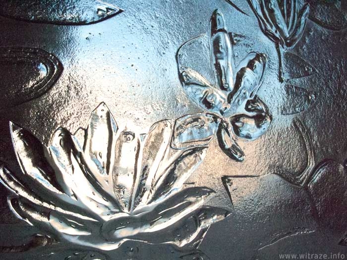 Panele szklane wykonano ze szkła bezbarwnego jako relief szklany z odwzorowaniem kwiatów lilii wodnych. Nasz klient samodzielnie postanowił wzbogacić dzieło poprzez umieszczenie w tle folii barwnej. Całość podświetlił diodami LED. Na zdjęciach prezentujemy bezbarwny panel wykonany przez nas oraz pracę po "spersonalizowaniu" przez klienta.
