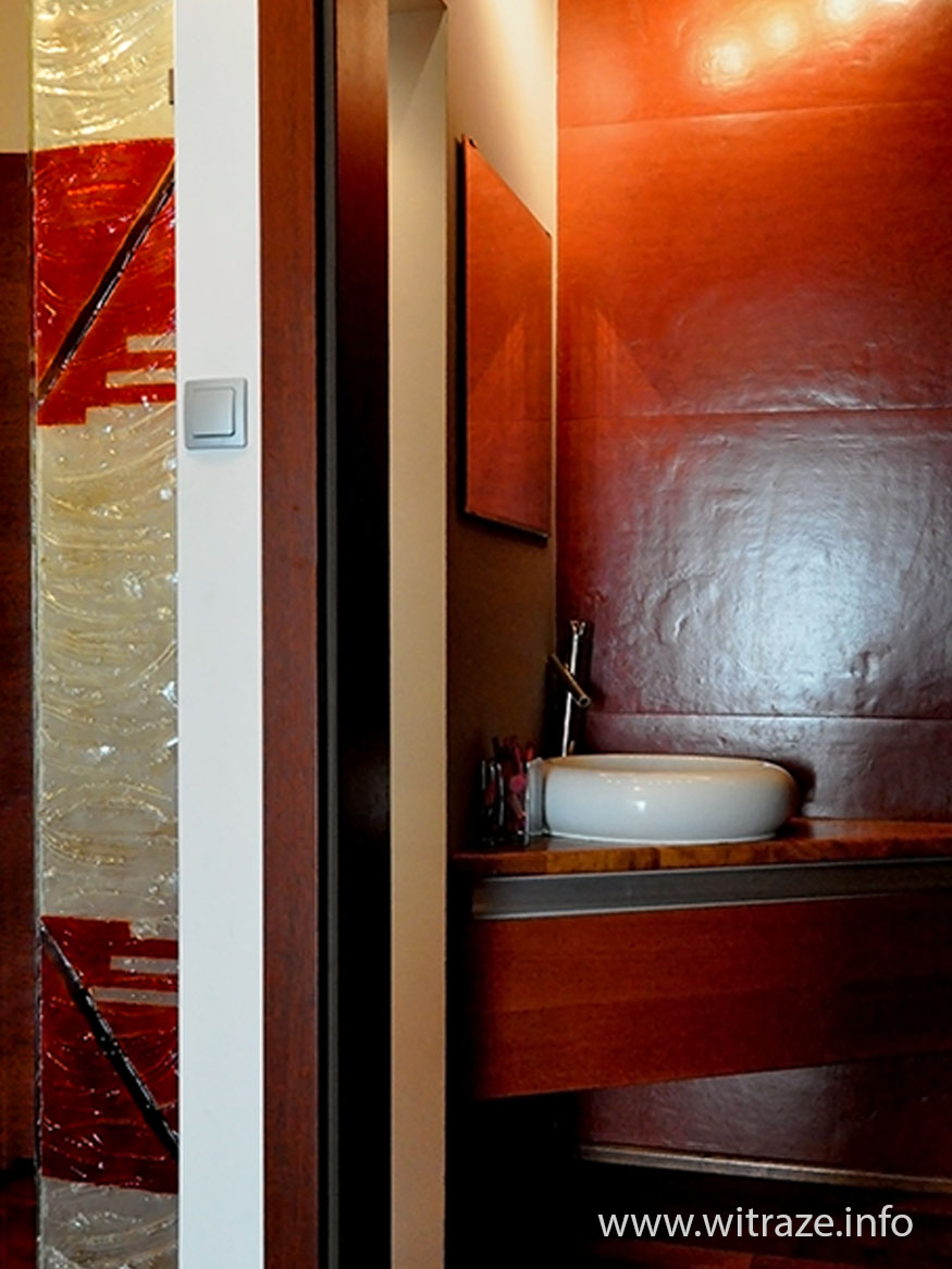 Fused glass panels as a partition between the bathroom and the hall. Edgy, geometric design by architect Hanna Prądzyńska.