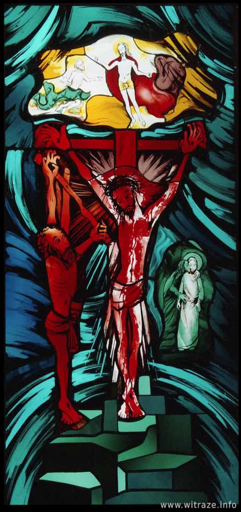 Scena wyobraża dialog umierającego Chrystusa z umierającym Dobrym Łotrem: "My przecież - sprawiedliwie - odbieramy bowiem słuszną karę za nasze uczynki /.../ I dodał: "Jezu, wspomnij na mnie, gdy przyjdziesz do swego królestwa" Jezus mu odpowiedział: "Zaprawdę powiadam ci, dziś ze Mną będziesz w raju." (Łk.23,41-43). Aby podkreślić wagę tego wydarzenia przedstawione są tylko dwa krzyże. W górze witraża wyobrażony jest Chrystus zmartwychwstały i Dobry Łotr jako pierwszy święty towarzyszący Chrystusowi. Po prawej stronie Krzyża wyobrażona jest scena pocałunku Judasza danego Chrystusowi. Judasz towarzyszył Chrystusowi przez 3 lata jako Jego uczeń i wydał na śmierć Przyjaciela i Mistrza. Później nie wierząc w miłość Chrystusa do niego- Judasza nie potrafi błagać o przebaczenie tej zbrodni i zatraca się. "Dobry Łotr" dokonał wielu zbrodni, ale uznaje swoją winę i ufnie zwraca się do Chrystusa, który jednym słowem przebaczenia wprowadza go do Raju.